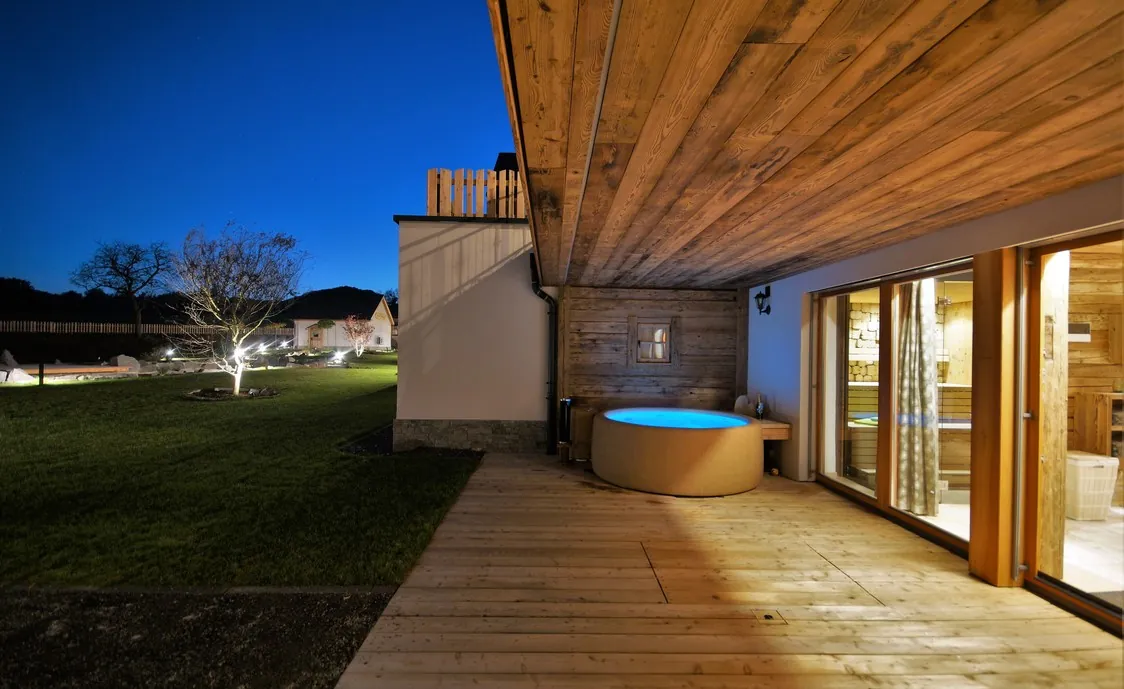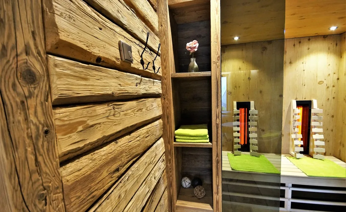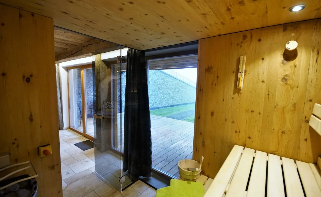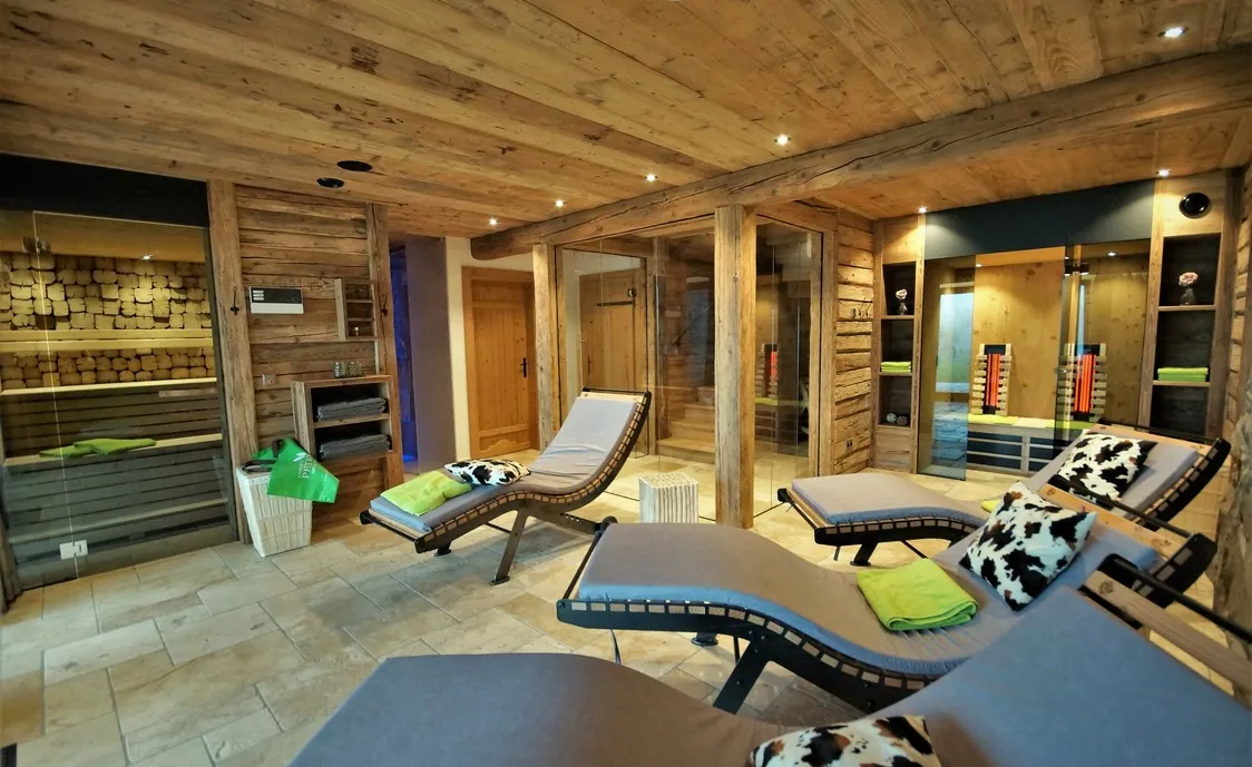 Im Untergeschoss befindet sich der private Wellnessbereich mit Panorama-Sauna, Infrarot-Doppelkabine, Außenwhirlpool, Liegen und einem Sanitärbereich.