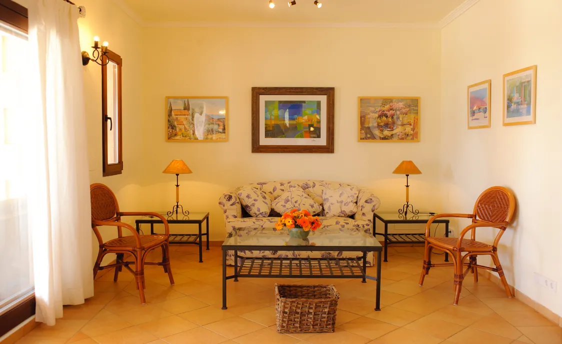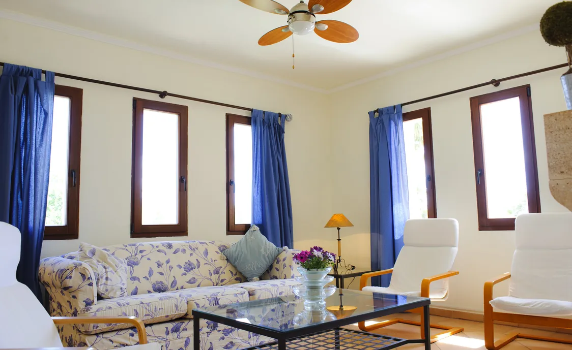 • Wohnzimmer 1: Heizung , Deckenventilator, TV, DVD, SAT englisch, SAT deutsch, Kamin/Holzofen