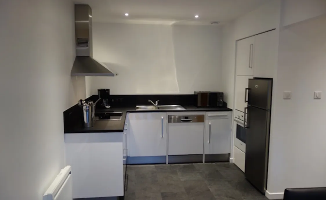 • Im Erdgeschoss gibt es ein Wohnzimmer mit einer komplett ausgestatteten Küchenzeile