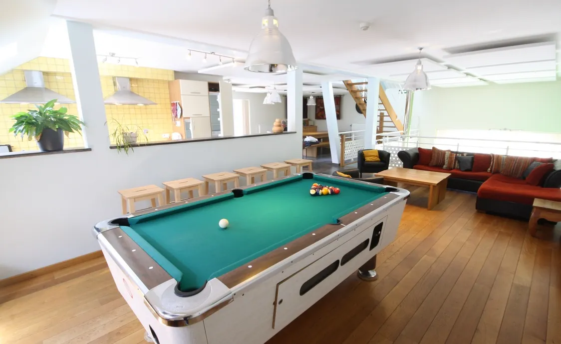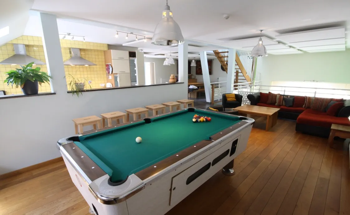 Ebenfalls im Erdgeschoss befindet sich ein gemütliches Wohnzimmer mit einem Billard und einer einladenden Bar.