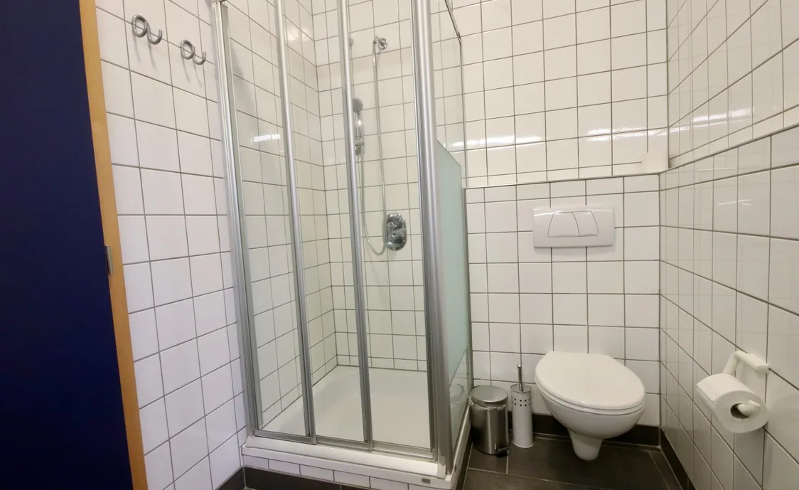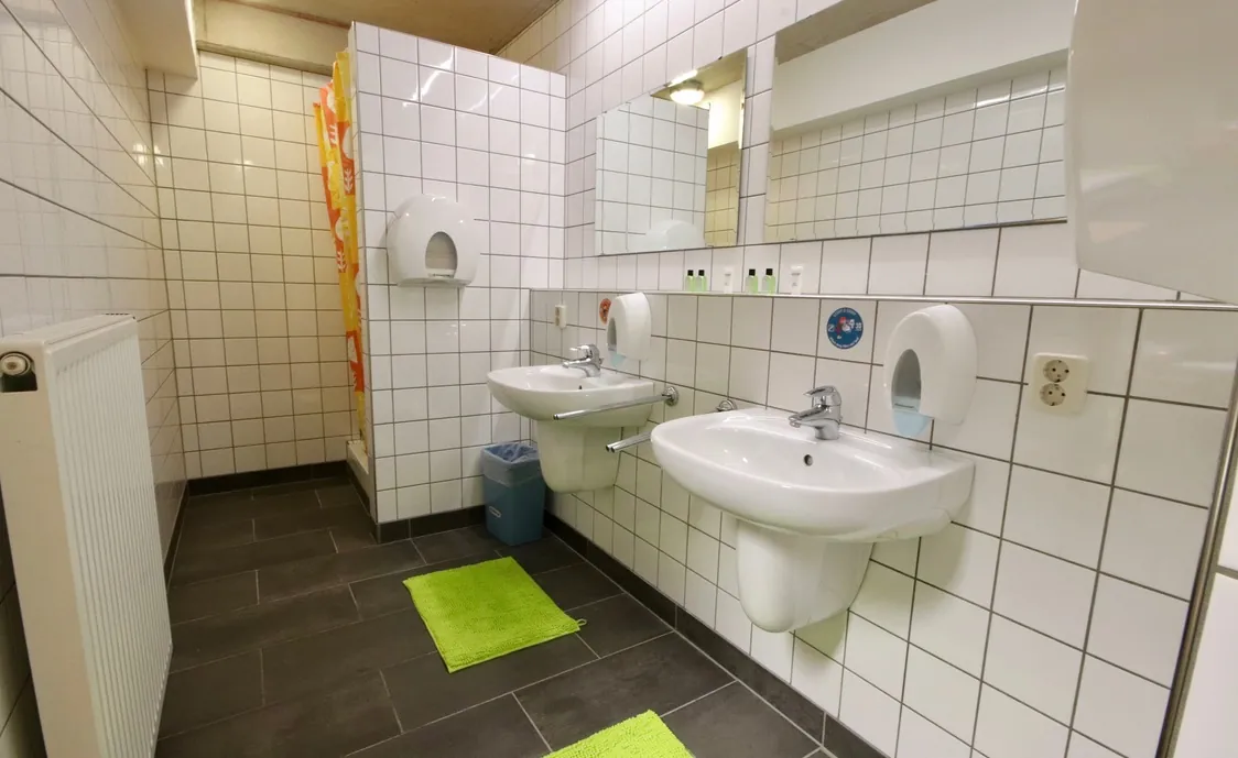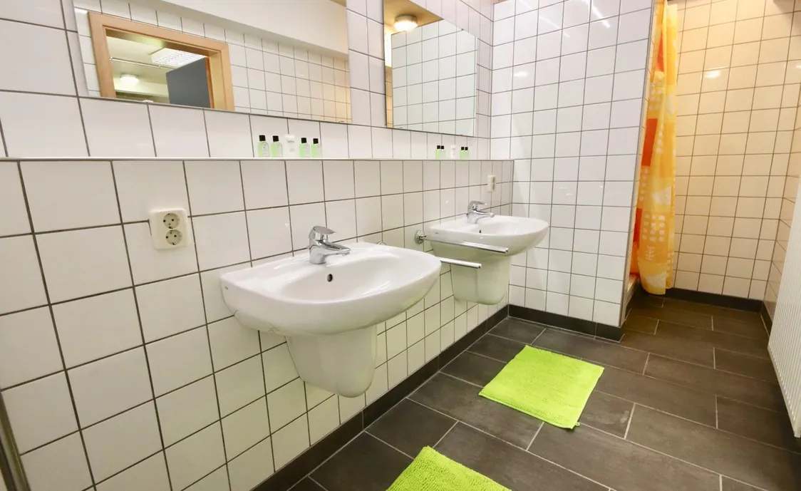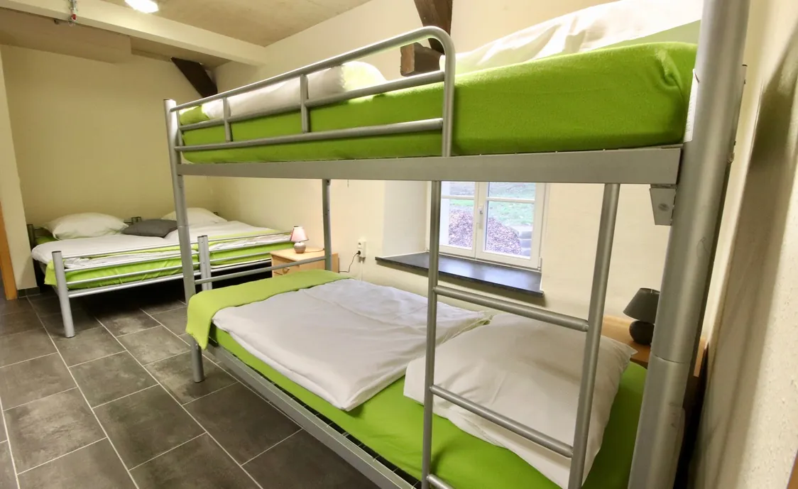 - ein Zimmer mit 2 Einzelbetten und 2 Etagenbetten mit Bad