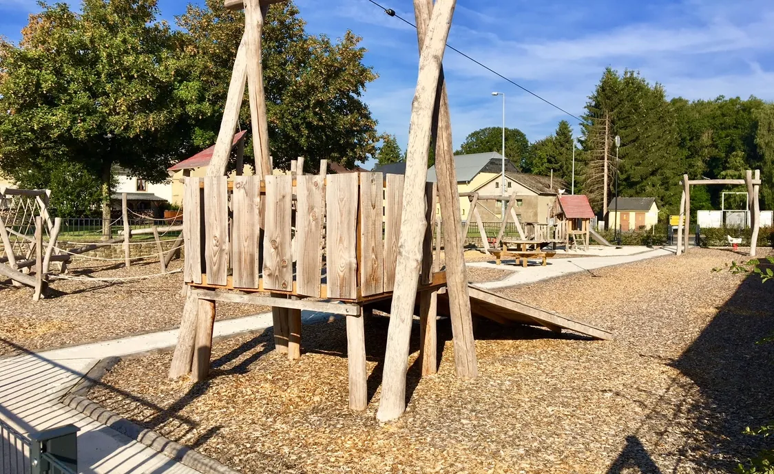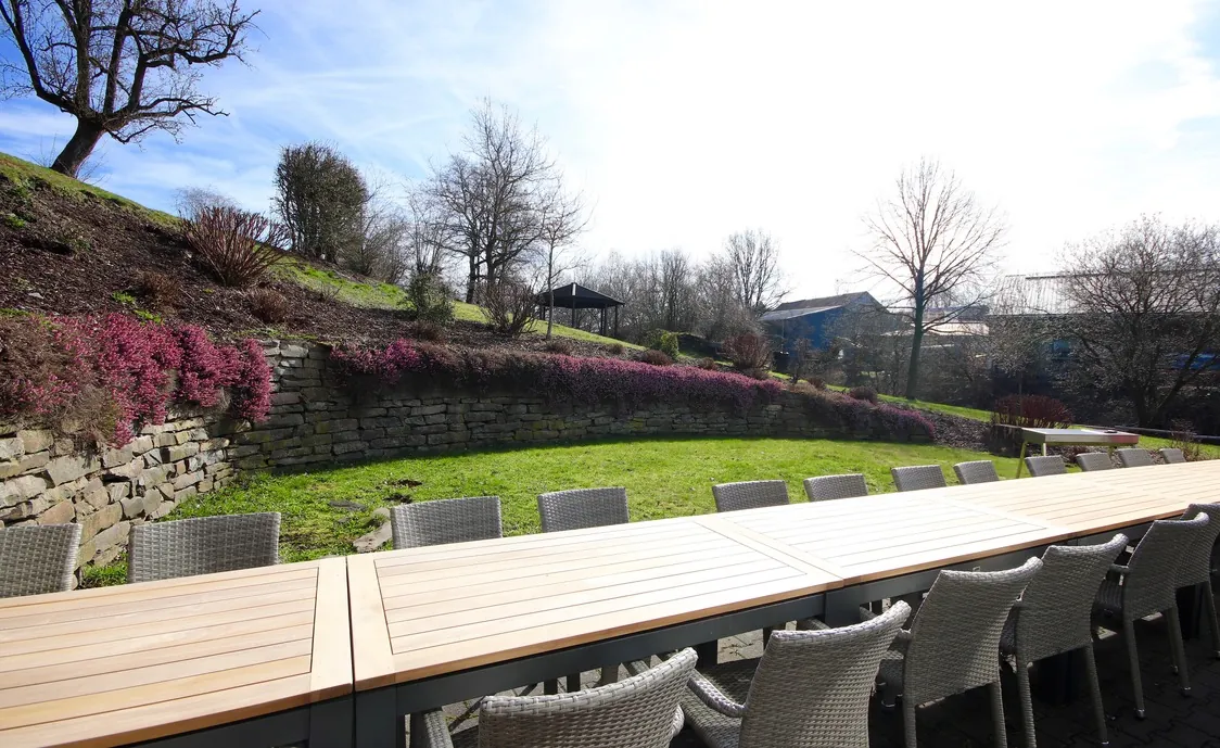 Der große Außenbereich bietet Ihnen einen großen Garten mit Trampolin und Spielplatz für die Kinder.