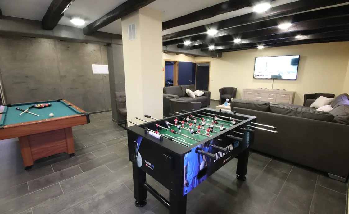 Das Ferienhaus bietet Platz für 24 Personen und verfügt insgesamt über 8 Schlafzimmer und 7 Badezimmer. Es gibt eine voll ausgestattete Küche und eine kleine Küche mit Frühstücksraum. Einen Gemeinschaftsraum mit Fernseher und Sitzmöglichkeiten. Desweiteren gibt es eine Bar, wo Sie gemütlich zusammen sitzen können und eine Runde Dart oder Billard spielen können.