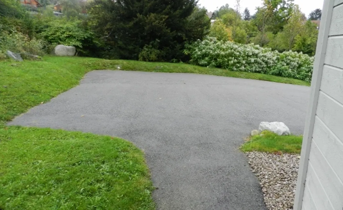 Eine möblierte Terrasse mit Grillplatz, Garten und Parkplatz für mehrere Autos