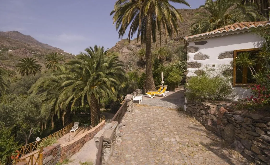 Dieses Ferienhaus in einem der Talhänge des Barranco de Tirajana wird von Palmen und Schilfrohr eingerahmt.