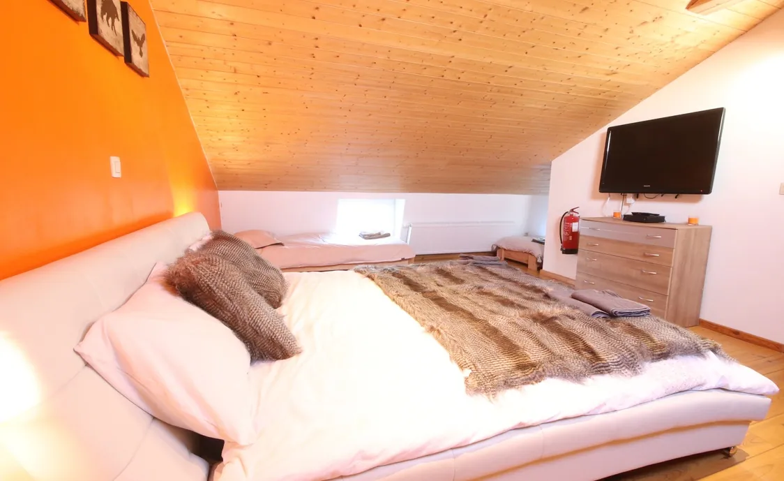 Das Ferienhaus verfügt insgesamt über 3 Schlafzimmer. Das erste Schlafzimmer ist mit einem Doppelbett ausgestattet, das 2. Schlafzimmer mit einem Doppelbett und einem Einzelbett und im 3. Schlafzimmer gibt es ein Doppelbett und 2 Einzelbetten.