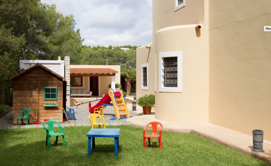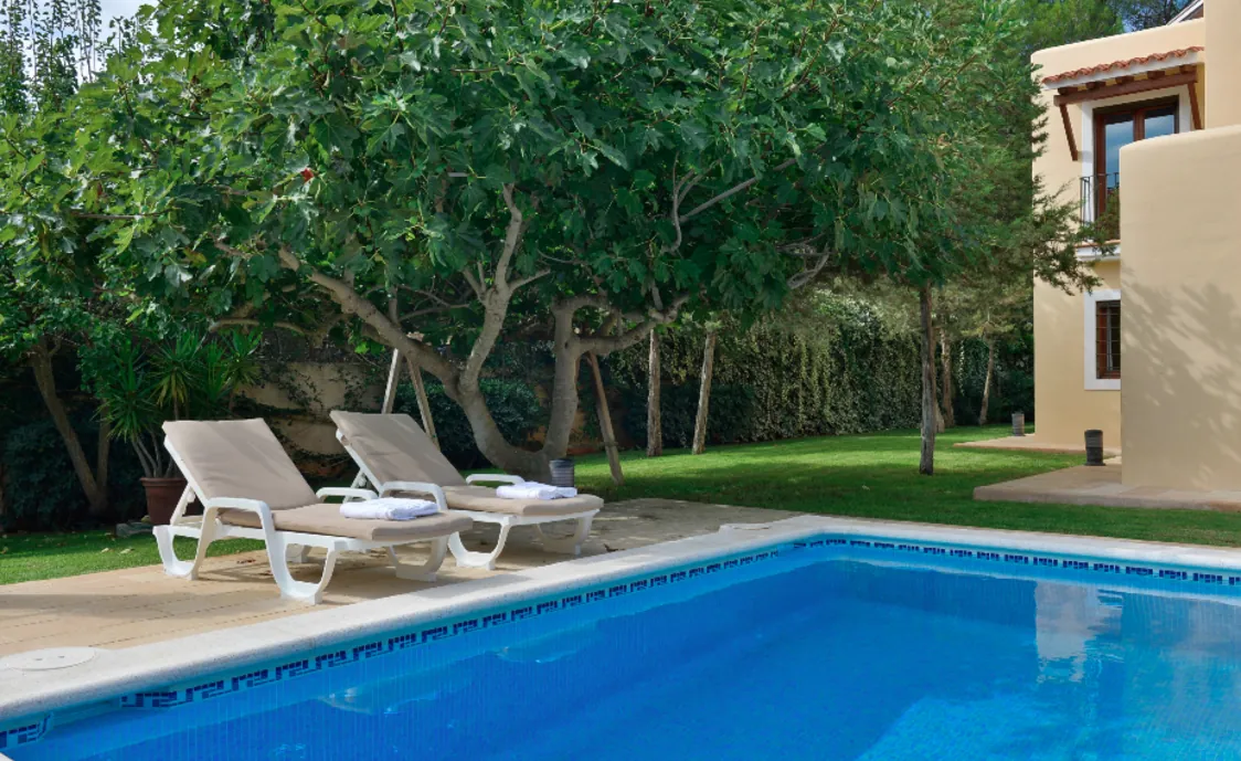 Der Gartenbereich bietet neben einem großen Pool noch eine Terrasse mit Gartenmöbel und Sonnenliegen, sowie ein kleiner Spielplatz für Kinder.