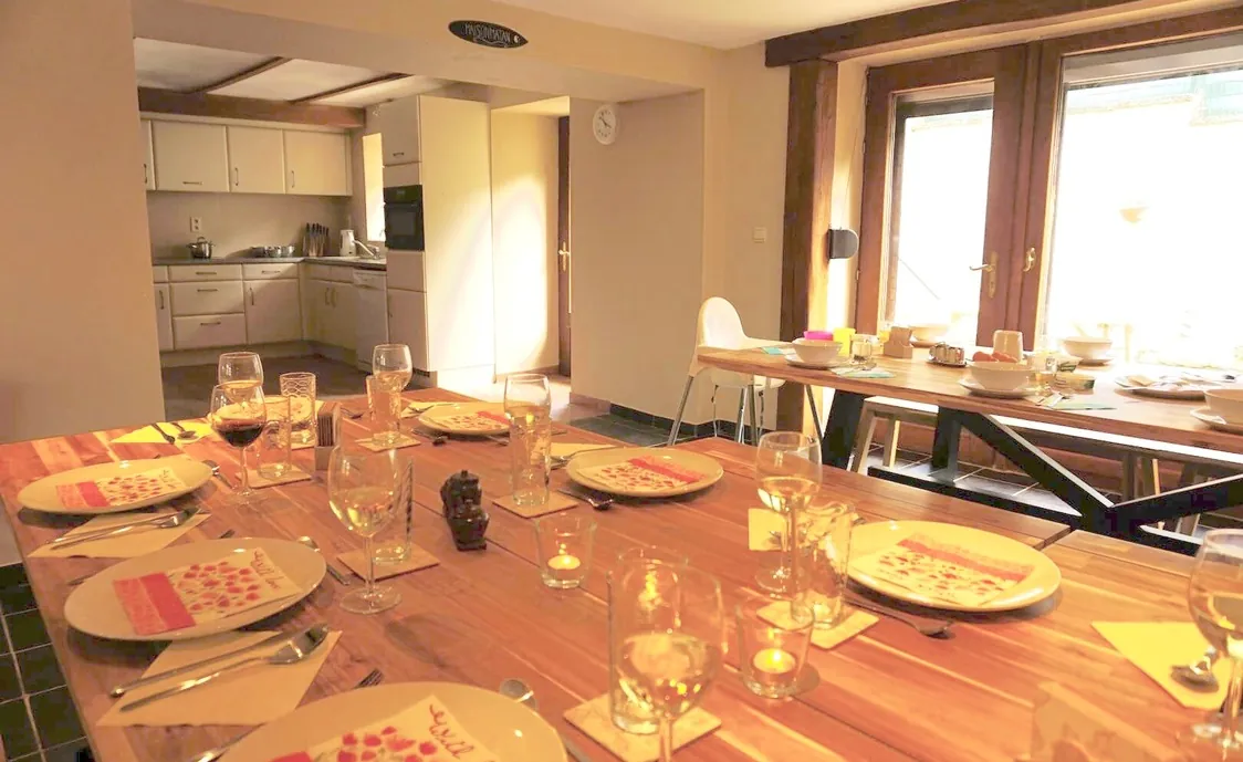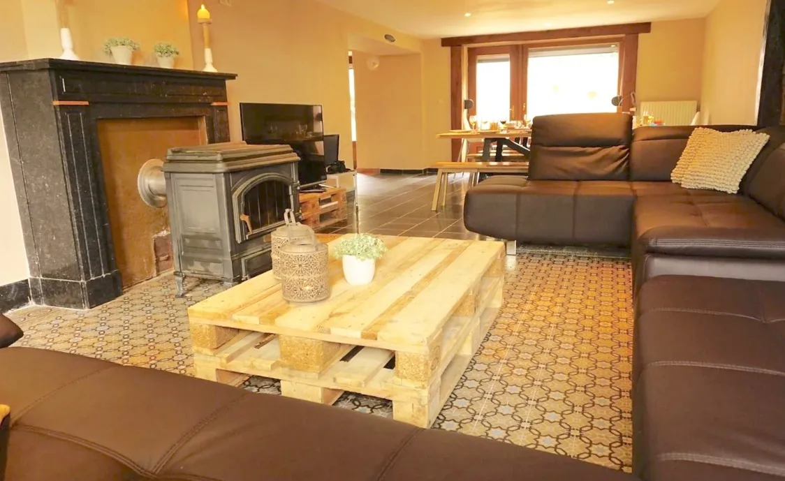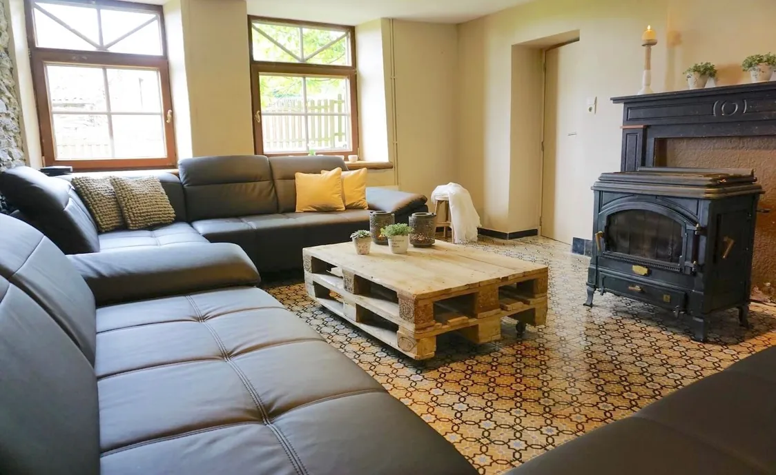 Im Erdgeschoss befindet sich ein schönes grosses Wohnzimmer welches mit einem Holzofen ausgestattet ist und somit dem ganzen Zimmer eine gemütliche Atmosphäre verleiht. Die offene Küche ist voll ausgestattet und das Esszimmer bietet ebenfalls genügend Platz, um die ganze Gruppe zusammen zu bringen.