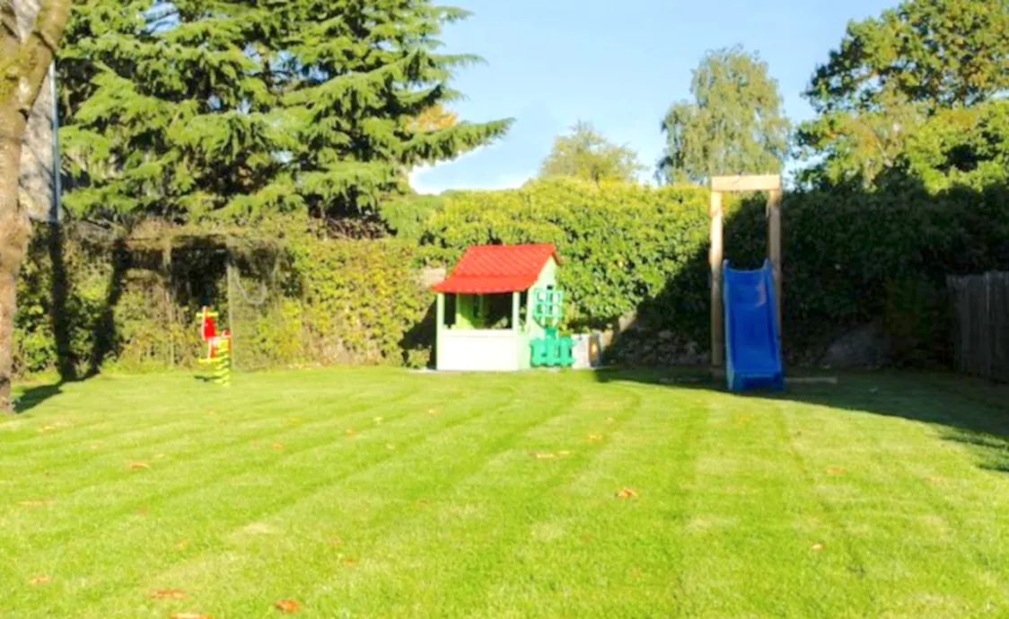 Der große Garten ist komplett eingezäunt und ist auf mehrere Ebenen verteilt.