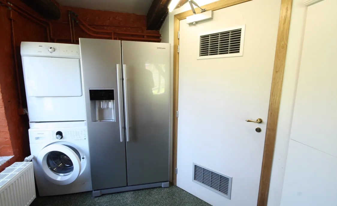 Eine Waschküche mit Waschmaschine und Trockner sowie ein Bügeleisen sind ebenfalls im Haus vorhanden.