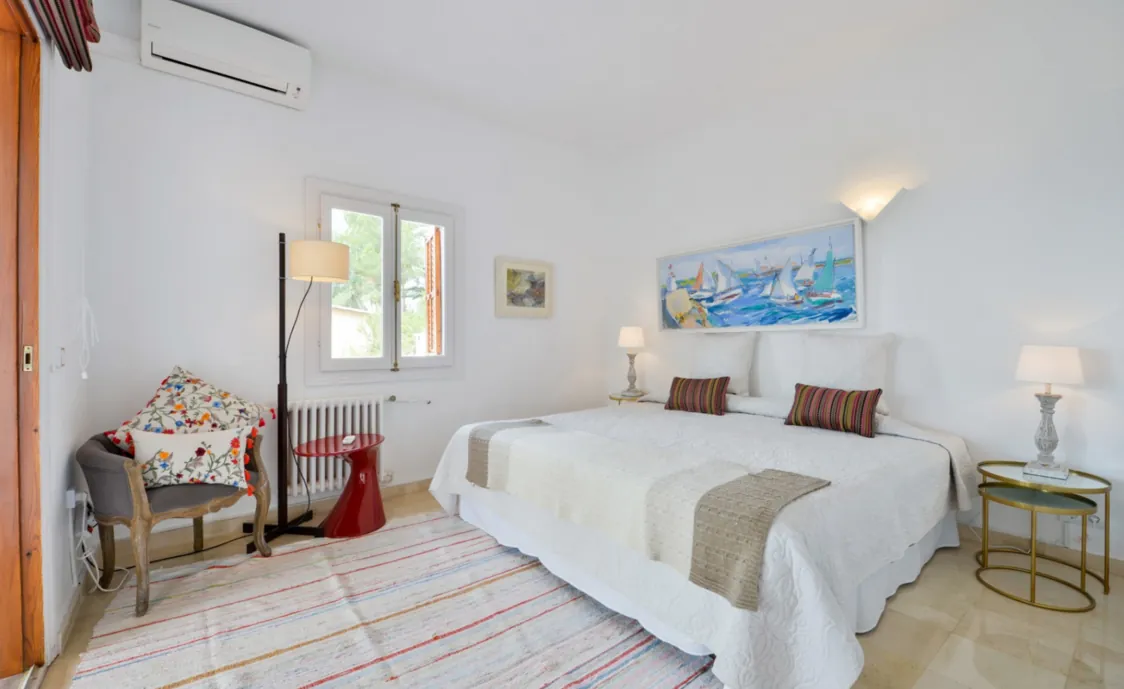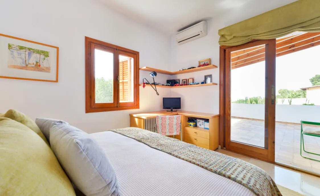 - Schlafzimmer mit Doppelbett, Terrasse und Aussicht auf Ibiza
