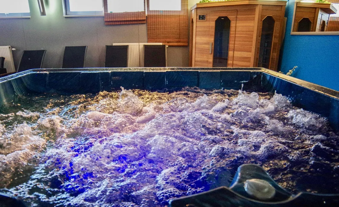 Im unteren Stockwerk finden Sie den Wellnessbereich mit Sauna, Hamam, Whirlpool und Duschen.