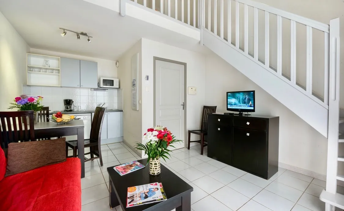 Das 1 Zimmer-Haus mit Mezzanine für 4 Personen (32m²) stellt sich wie folgt zusammen: im Erdgeschoss, ein Wohnzimmer mit Schlafsofa (140×190 cm), ein Badezimmer mit WC und Dusche. In der Mezzanine sind zwei Einzelbetten (90×190 cm).
