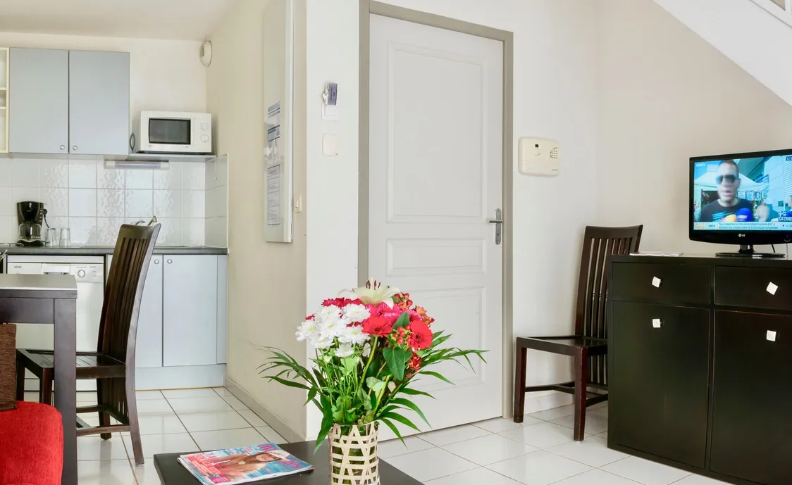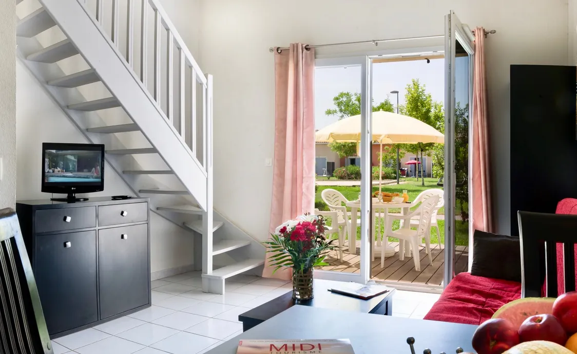 Wohnzimmer mit TV / TNT, Küchenzeile mit Kühlschrank, Geschirrspüler, Mikrowelle, Herd und Kaffeemaschine. Terrasse mit Gartenmöbeln.