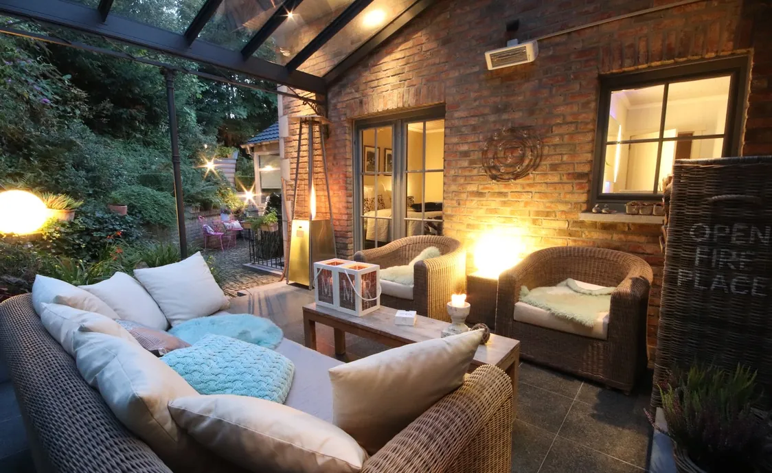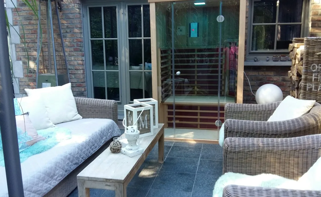 Doch auch die Terrasse mit Loungeecke im Außenbereich lässt keine Wünsche offen. Es gibt auch eine Infrarotkabine.