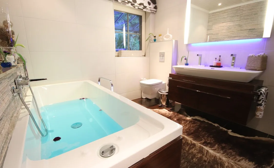 Das Highlight bildet der Garten im Außenbereich mit privatem Whirlpool mit Nano Technologie, der zu jeder Jahreszeit genutzt werden kann.