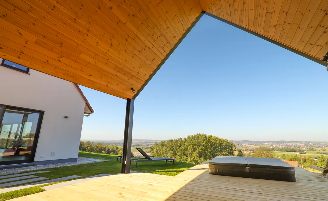 Im Außenbereich befindet sich eine überdachte Terrasse mit Gasgrill, Terrassenbeheizung, Liegestühlen sowie einem Jacuzzi zum entspannen.