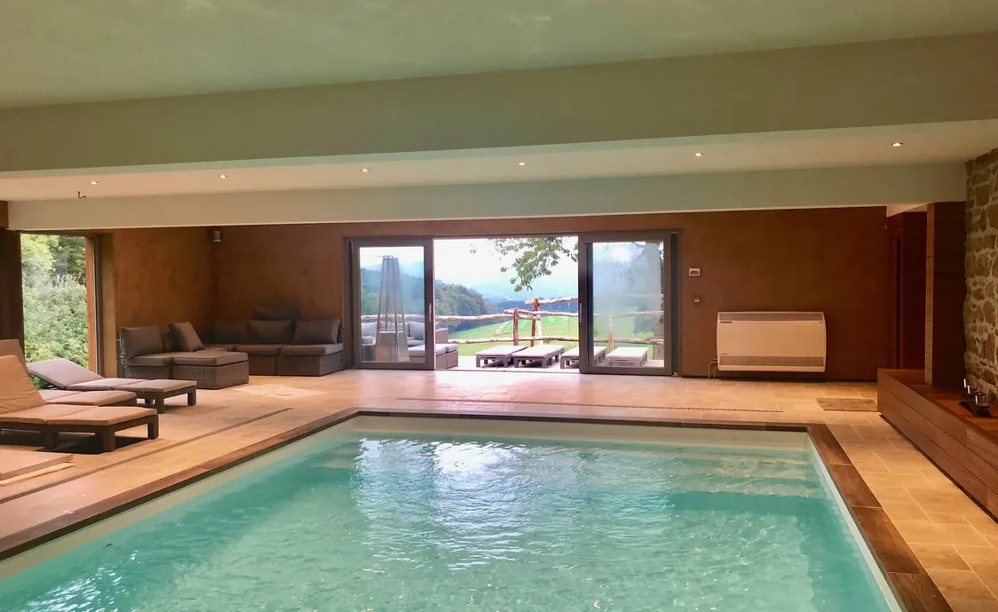 Vom Esszimmer gelangen Sie in den Wellnessbereich mit Innenschwimmbad, Sauna, Dusche und Liegestühle. Der Wellnessbereich bietet Ihnen eine wunderschöne Aussicht auf das Gehege mit Kleintieren. Vom Wellnessbereich gelangen Sie auf die große Terrasse mit Loungeecke und großem Tisch. Ein Grill steht Ihnen ebenfalls zur Verfügung.