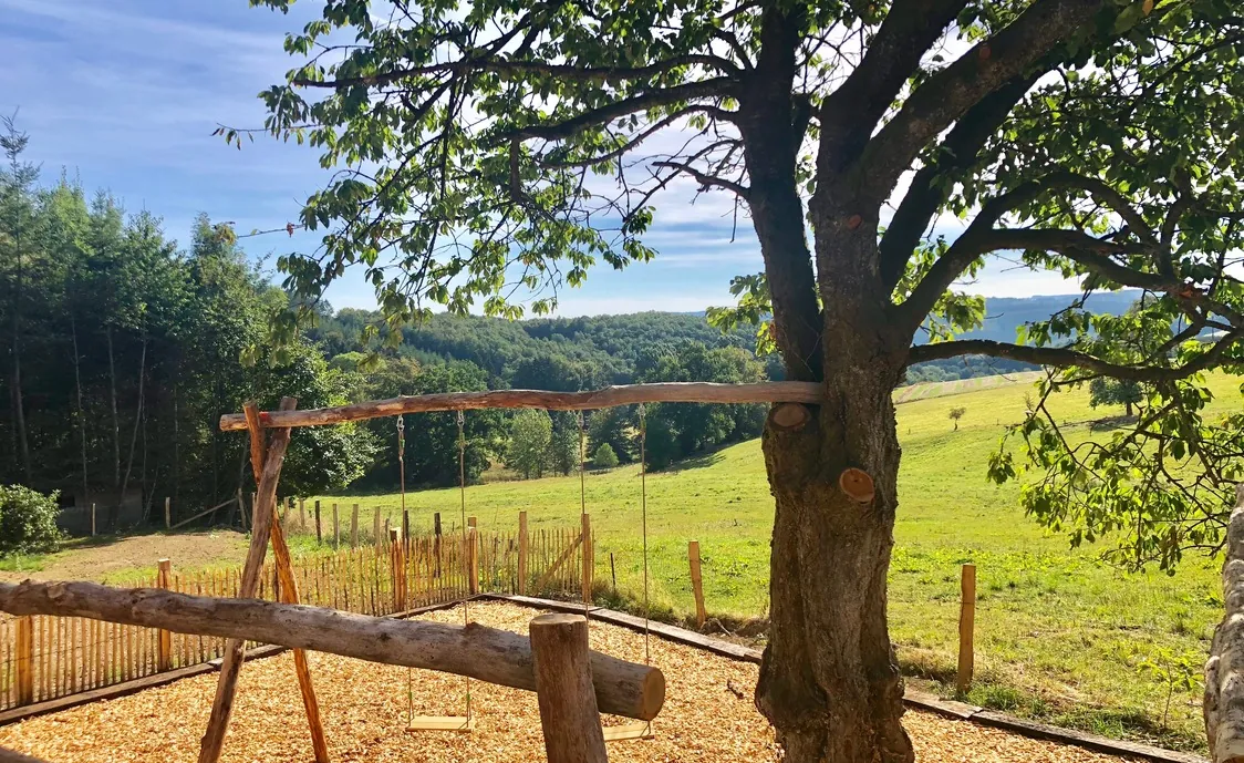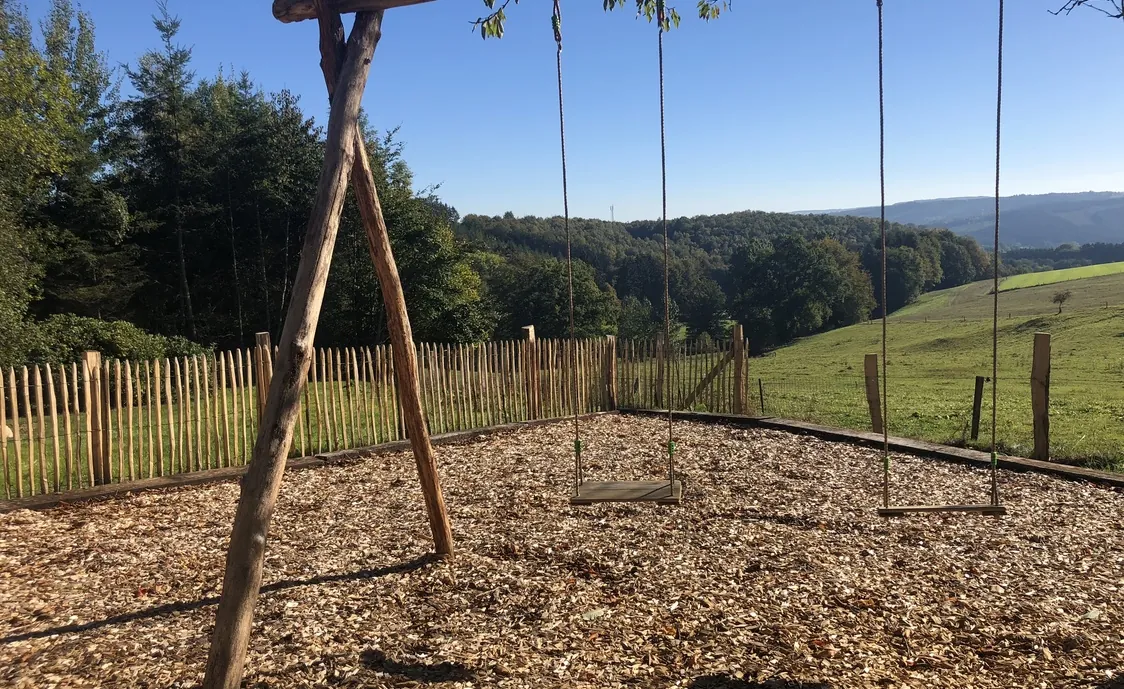 Im Außenbereich befindet sich ebenfalls eine Schaukel für Kinder und ein Gehege mit Kleintieren.