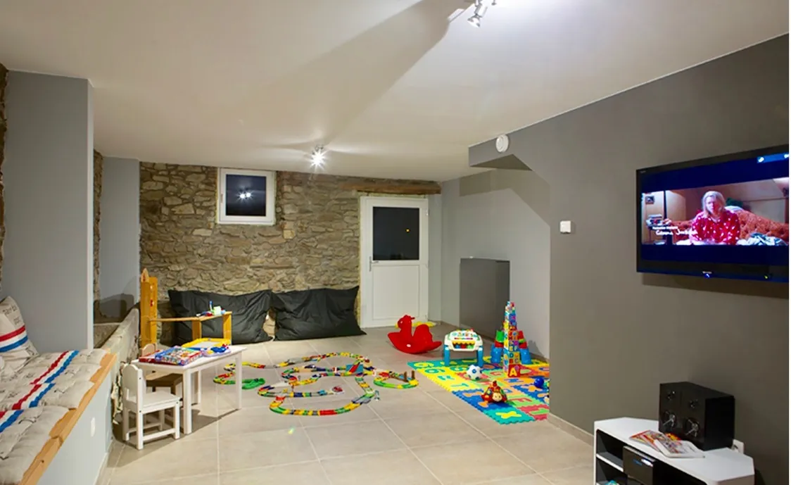Im Keller finden Sie einen Spielraum für Kinder, mit ausreichend Spielen für Kleinkinder und einer gemütlichen Sitzgelegenheit mit einem Fernseher.