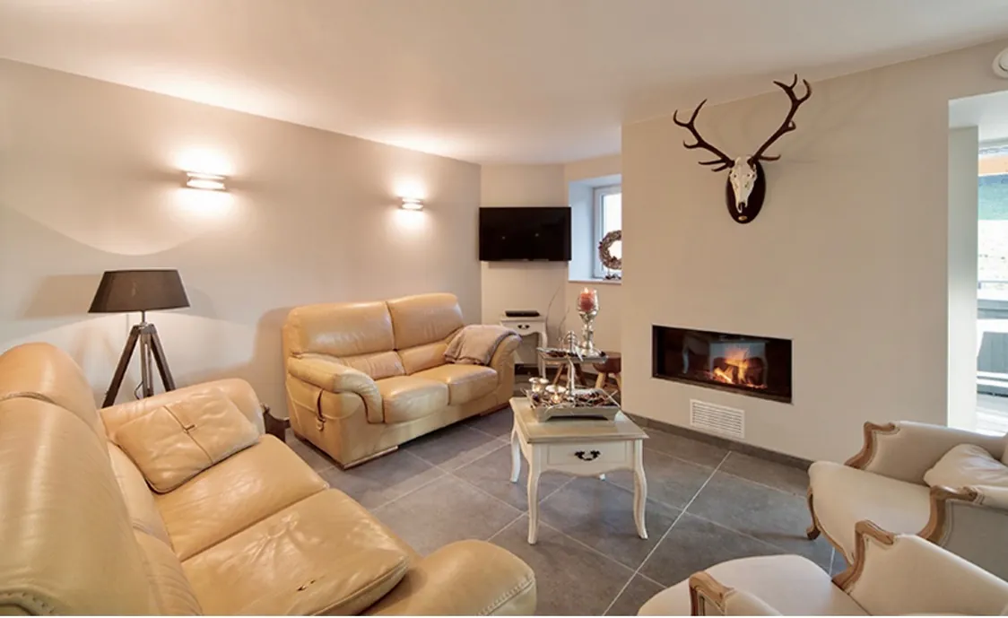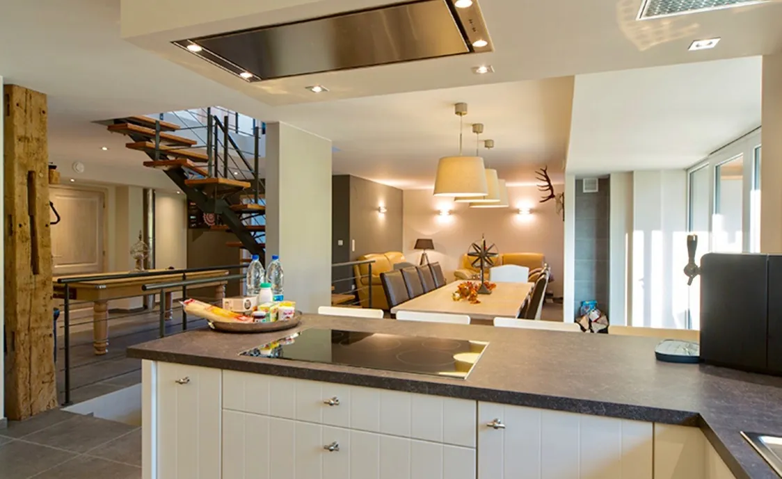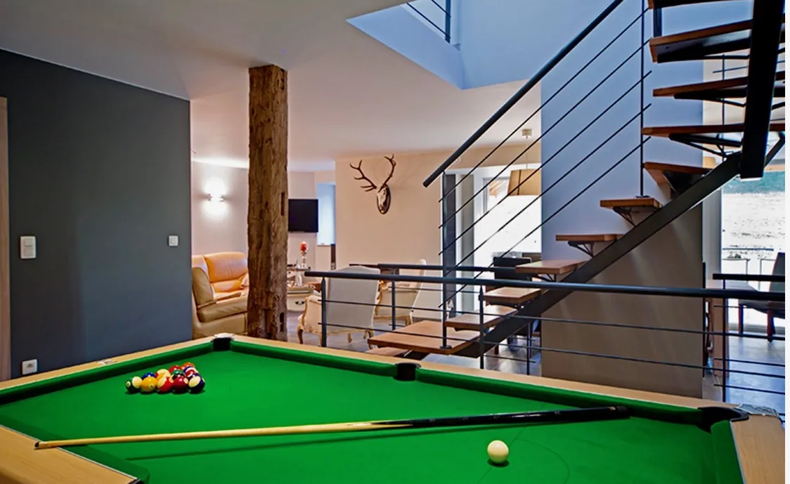 Der Wohnbereich bietet mit dem Kamin eine sehr gemütliche und familiäre Atmosphäre. Im offenen Wohnraum befindet sich ebenfalls der Billardtisch.