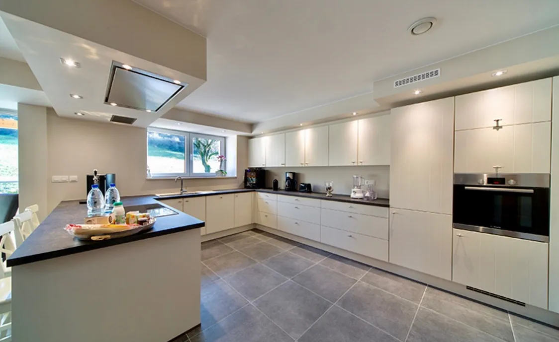 Die grosse offene Küche ist mit vielen Küchengeräten und Küchenutensilien ausgestattet. Der grosse Esstisch trennt den Küchenbereich vom Wohnraum ab. Die grossen Glasfenster lassen viel natürliches Licht in das Haus und geben direkte Zugang zur Terrasse.