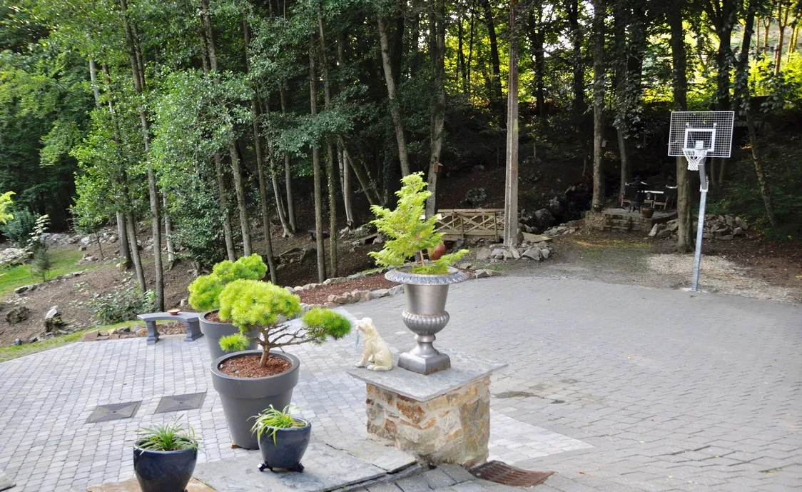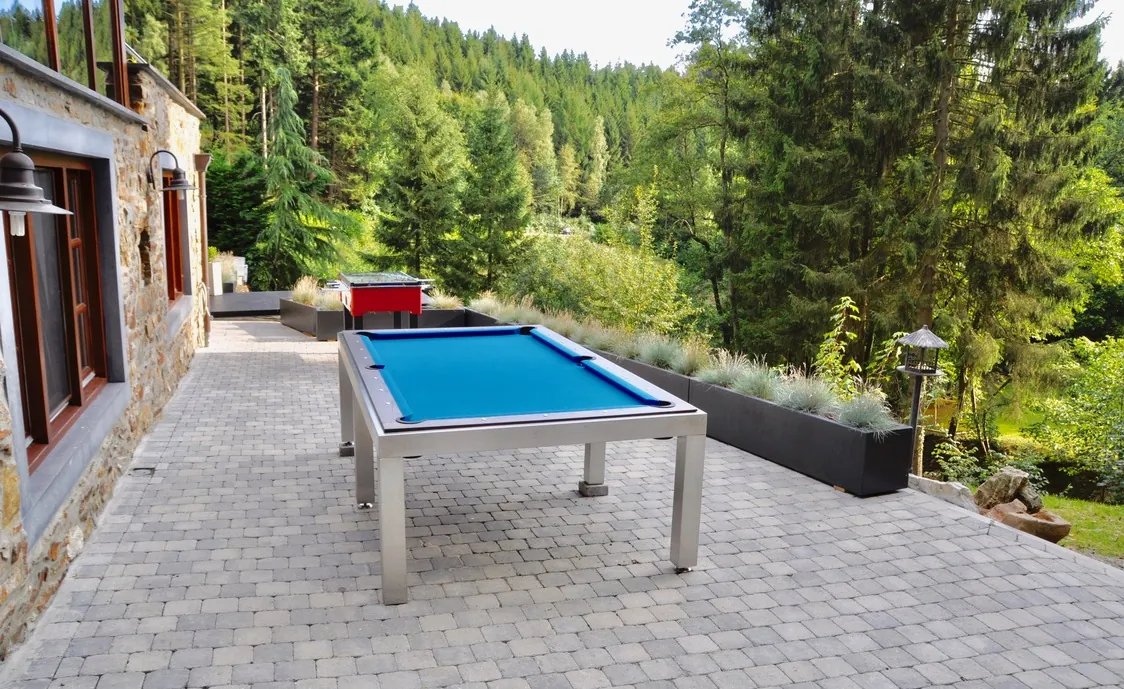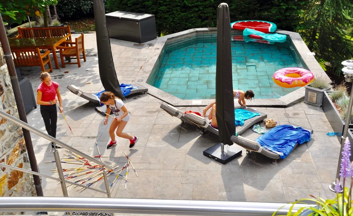 Der große Außenbereich bietet Ihnen einen großen beheizten Pool, der vom 18/05 – 23/09 geöffnet ist, eine Außendusche, Panorama-Terrassen, verschiedene Sitzecken, einen Grill, einen Billardtisch, Tischtennis und Kicker. Sie können ebenfalls Fußball, Basketball, Badminton und Schach spielen. Hier ist für jeden Geschmack etwas dabei.