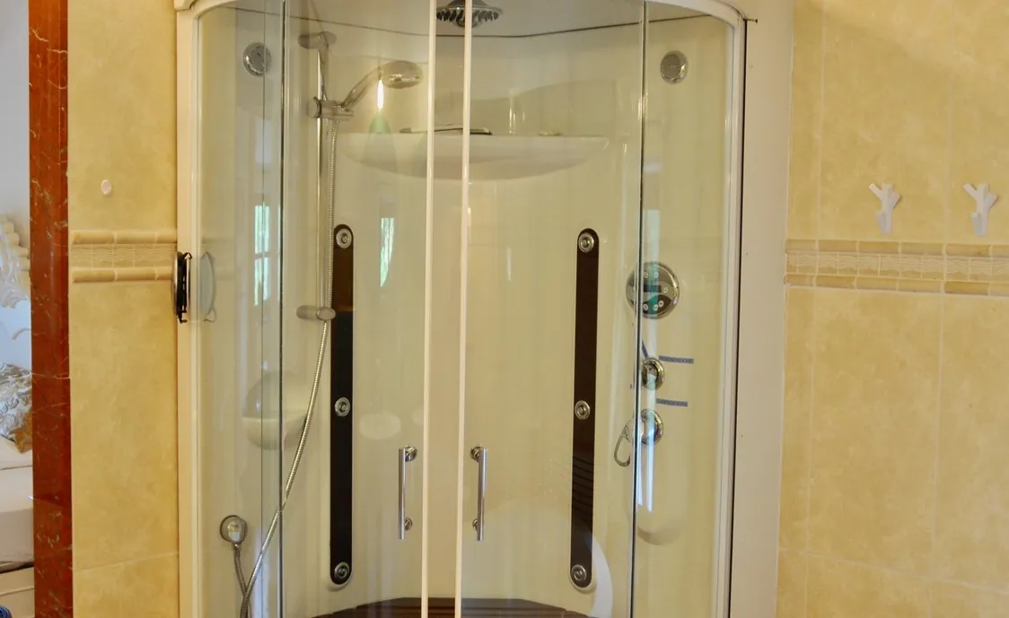 Eines der Schlafzimmer ist ebenfalls mit einer Infrarotsauna ausgestattet.