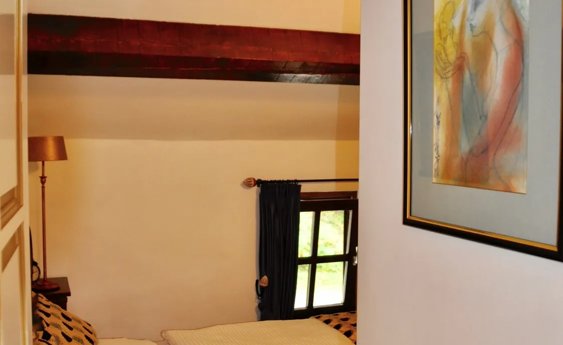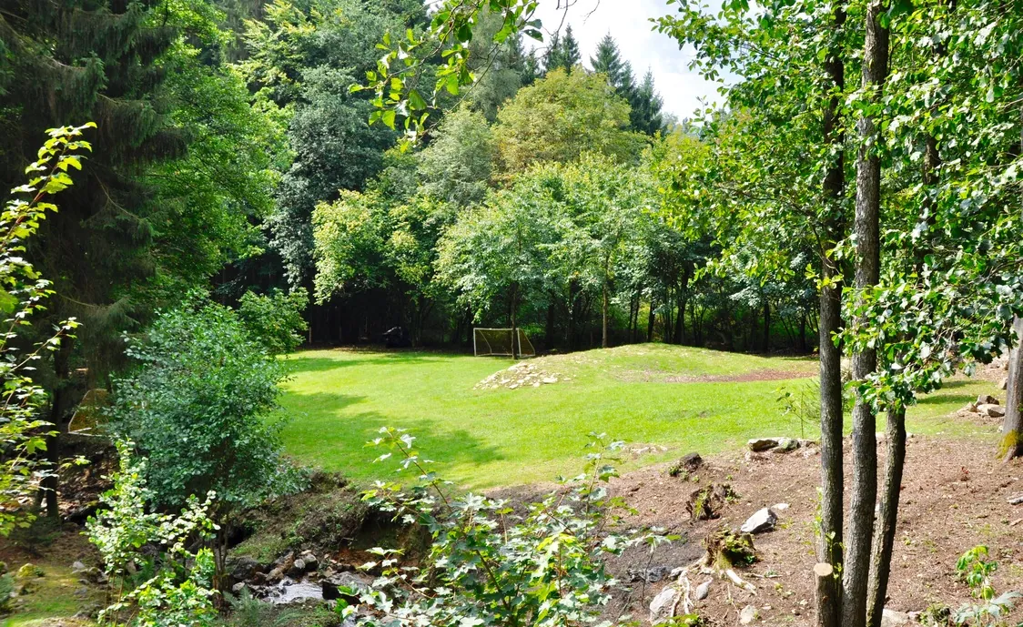 Der Garten ist komplett umzäunt und umgeben durch Wald und durch den Garten läuft der Fluss Le Nonnonruy mit Mini-Wasserfall.