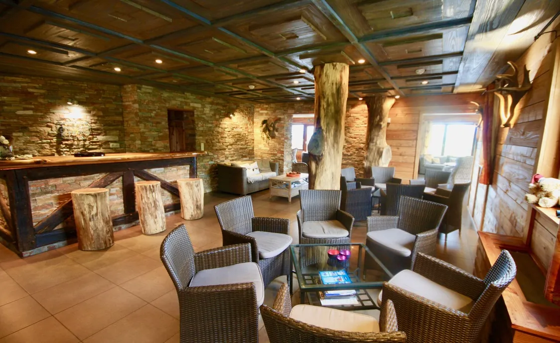 * Ein Barbereich mit Kühlschrank und Billardtisch.