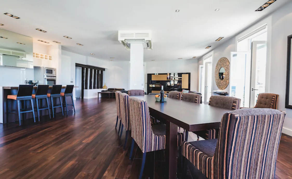 Diese Wohnung verfügt über einen offenen Wohnbereich mit einem Esstisch für zehn Personen und einem Flachbild-TV.