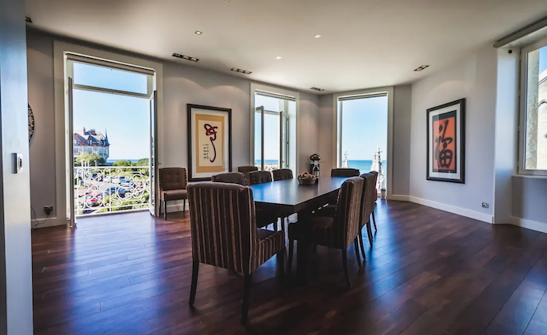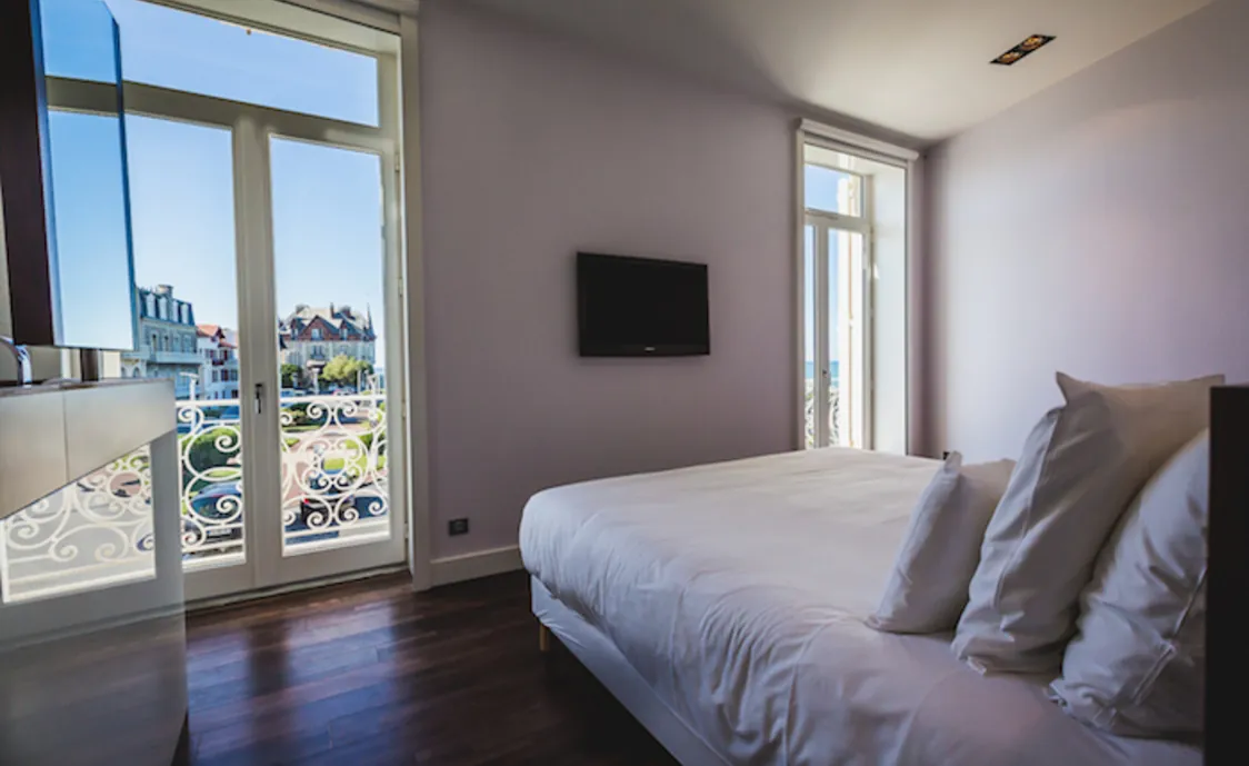 Die Luxus-Wohnung liegt nahe dem Strand und das moderne Appartement ist der perfekte Ort für einen schönen Urlaub. Es befindet sich im Herzen von Biarritz und vom Balkon aus, der sich über zwei Seiten der Wohnung erstreckt, haben Sie einen schönen Blick auf die Stadt.