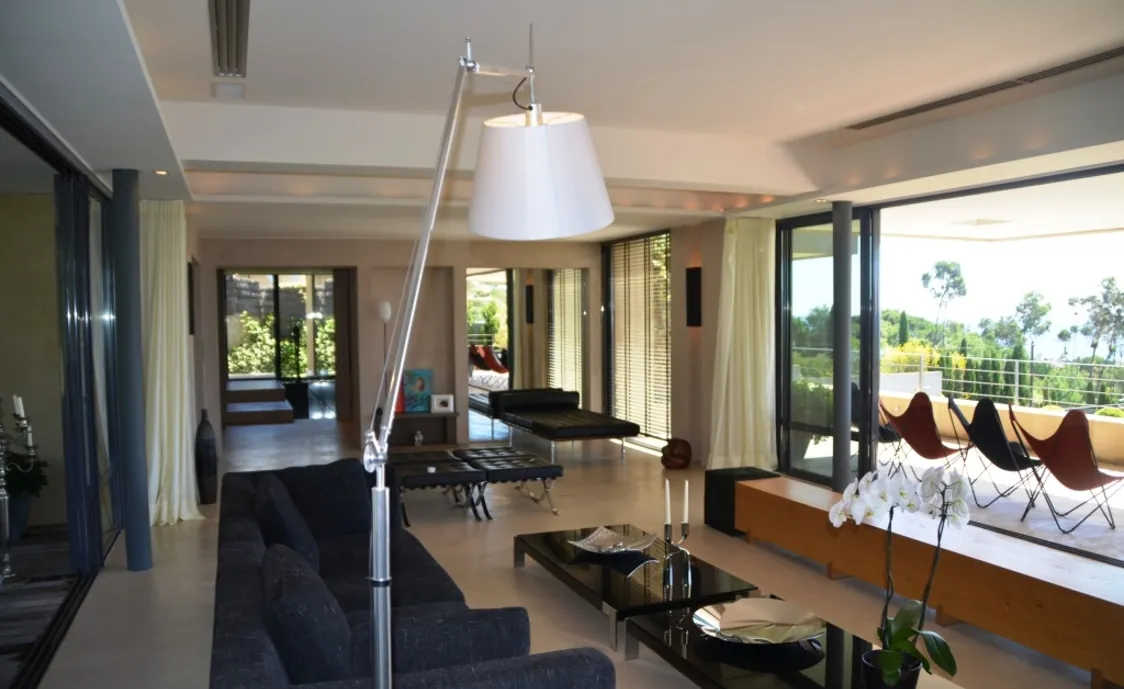 Großes Wohnzimmer mit Zugang zur Terrasse und dem Meer, durch die hintere Terrasse ideal für Gäste.