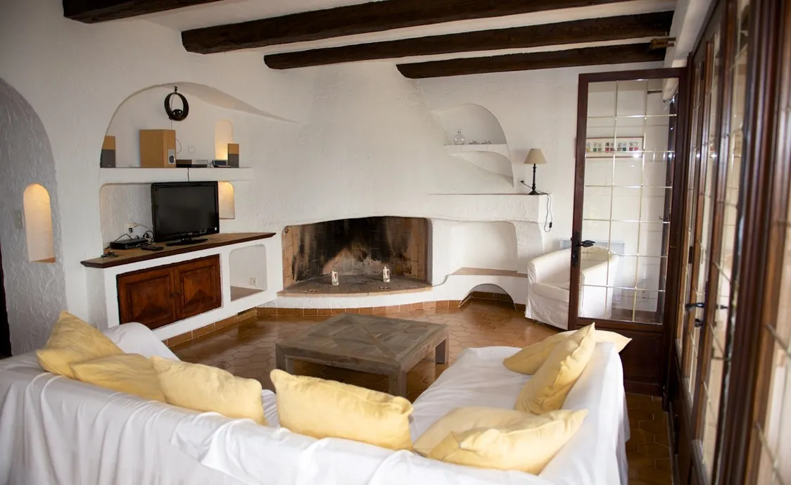 Der offene Wohn- und Essbereich verfügt über einen Esstisch mit Sitzgelegenheiten für 6 Personen, sowie einen Sofabereich mit Fernseher und einen Kamin für die kalten Tage im Jahr oder ein einfaches Zusammenkommen unter Leuten.