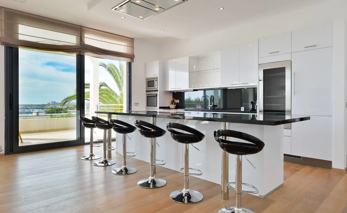 - Moderne, offene und komplett ausgestattete Küche, mit großer Kücheninsel und Essbereich.