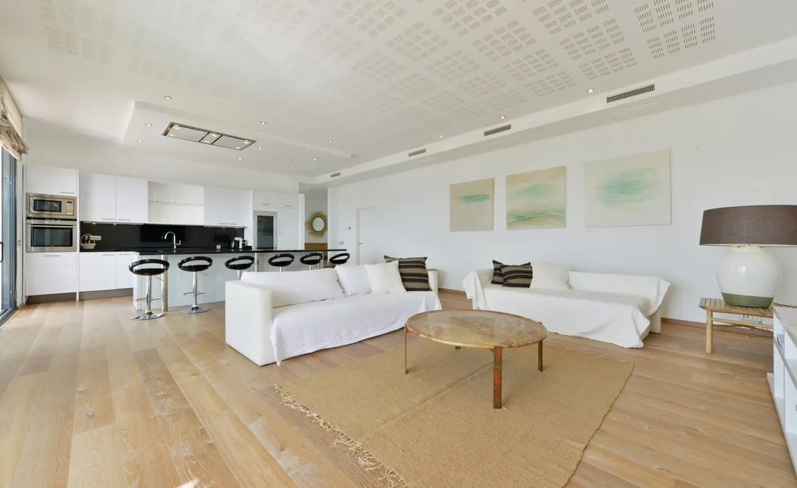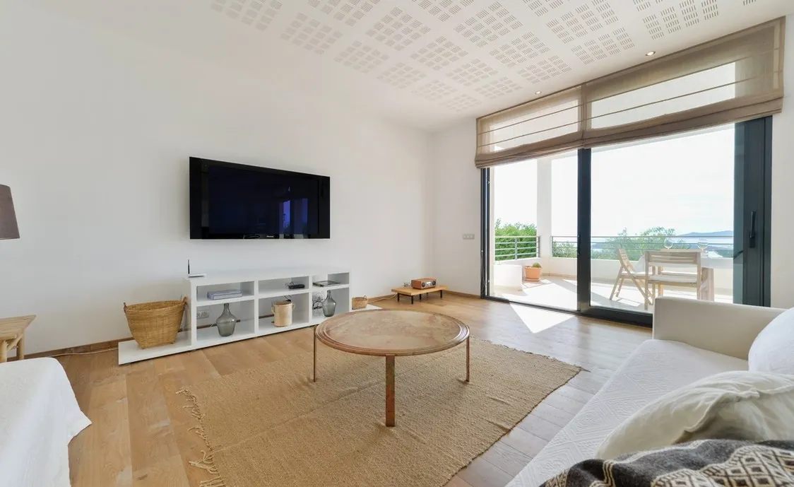 - Helles, geräumiges Wohnzimmer mit Fernseher und großen Fenstern mit Blick aufs Meer. Das Wohnzimmer verfügt über einen großen Balkon, der mit Gartenmöbeln ausgestattet ist.