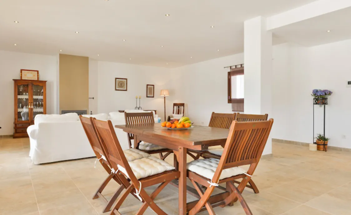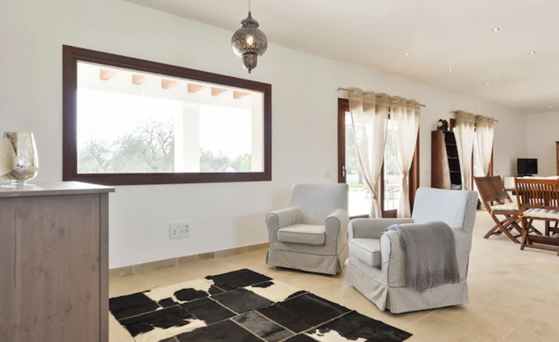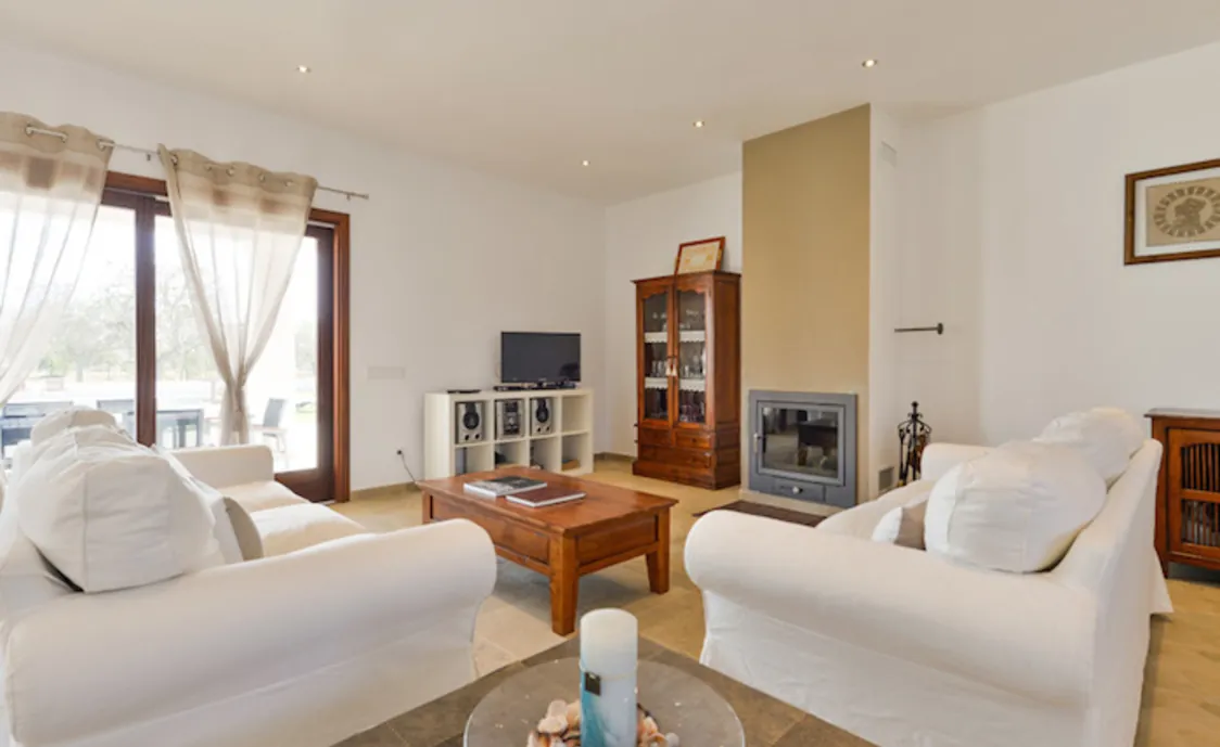 Wenn Sie die Ferienvilla betreten, befinden Sie sich direkt in das große und helle Wohnzimmer mit Bodenheizung (ohne Klimaanlage), Sat-Tv, Stereoanlage, Kamin, Klimaanlage und Internet.