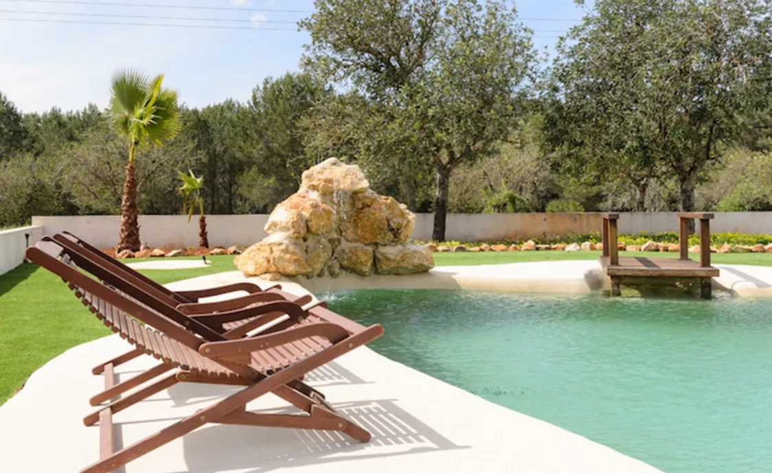 Im Außenbereich befindet sich die große Terrasse mit Gartenmöbel und Liegestühle sowie der große, sehr originelle Pool.