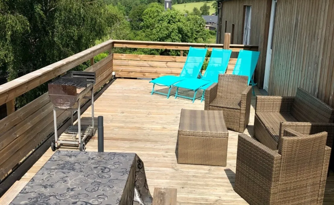 Die Terrasse mit den Gartenmöbeln und dem Grill bietet einen Blick auf die Landschaft und ihre Umgebung. Parkplätze stehen neben dem Haus zur Verfügung.