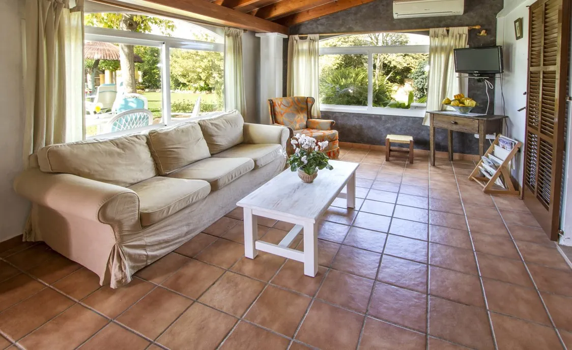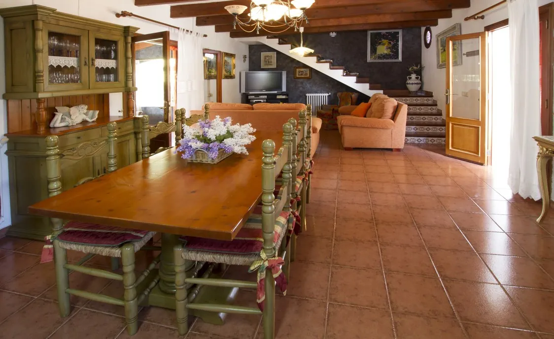 Die Villa hat schöne offene Räume, das Wohnzimmer mit Sofas, Fernseher und Esstisch bietet den perfekten Aufenthaltsraum um auch im Haus eine schöne Zeit zusammen zu verbringen.