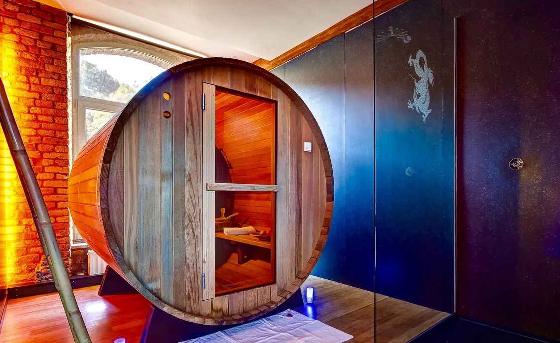 Ein Whirlpool, eine Sauna, eine Regendusche sind zum Gebrauch bereit.