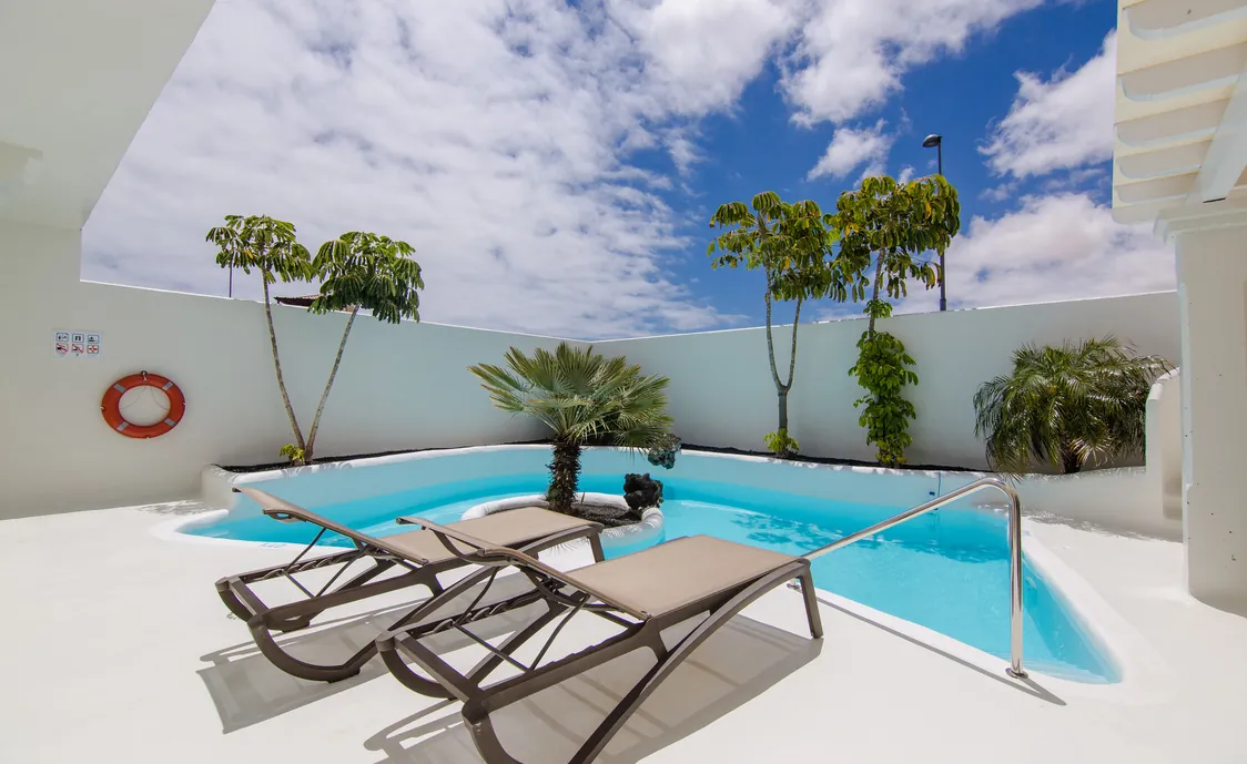 Außenbereich mit beheiztem Swimmingpool (auf Anfrage), der von Pflanzen umgeben ist und dadurch die Terrasse zu einem authentischen Tropenparadies macht.
