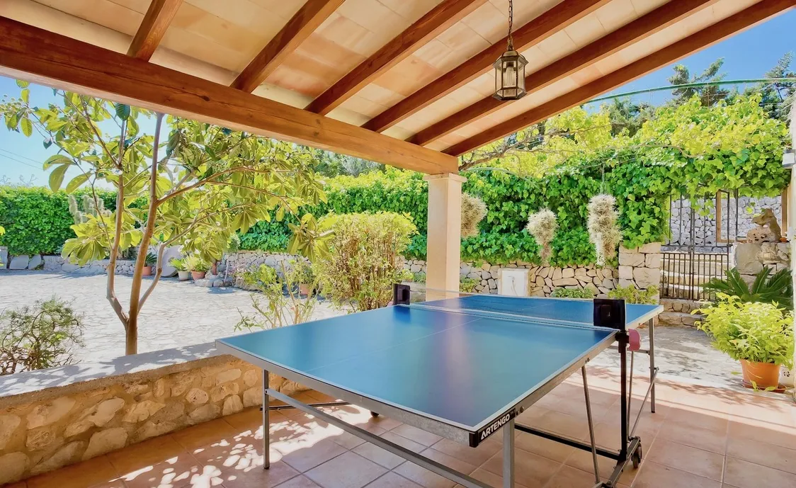 Von der Küche aus haben Sie ebenfalls direkten Zugang zu einer überdachten Terrasse. Dort befindet sich ebenfalls ein Esstisch und ein Tischtennistisch.