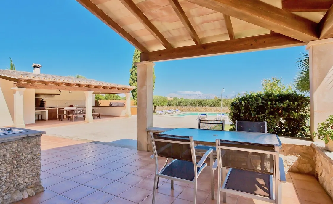 Zudem finden Sie eine überdachte Grillecke mit einem Esstisch und einem gemauerten Grill in Poolnähe.