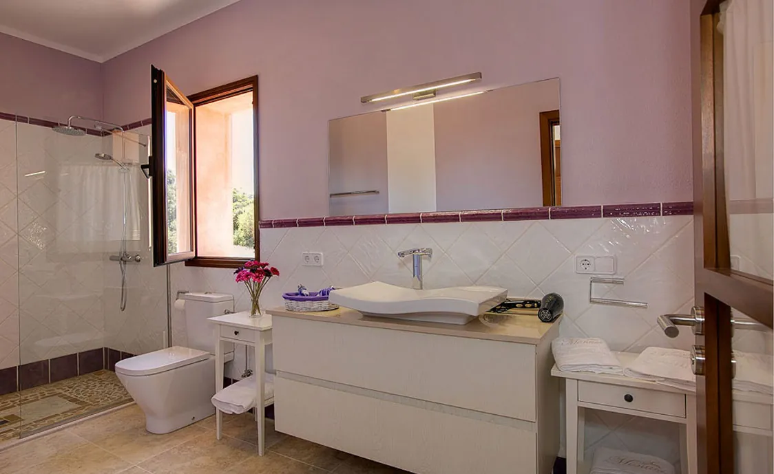 Die Doppelzimmer haben ein Bad mit Dusche, Ankleideraum und direkten Zugang zur Terrasse mit Essbereich.