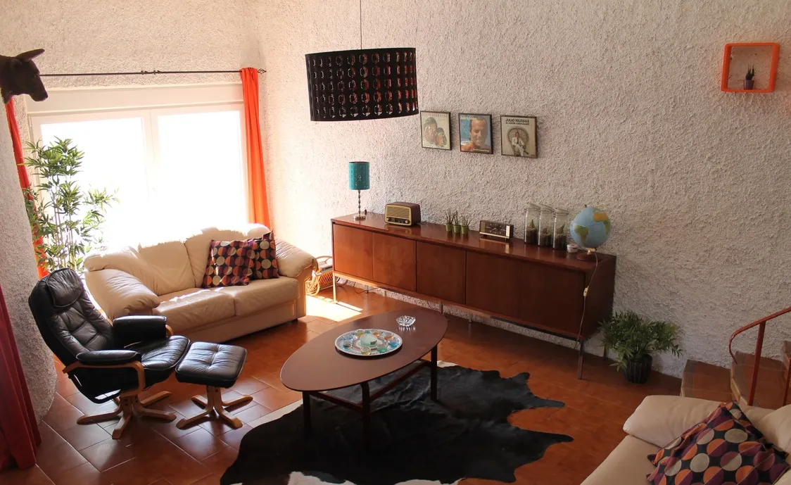 Auf der linken Seite befindet sich das helle und große Wohnzimmer und einige Stufen höher finden Sie das Esszimmer und direkt daneben die voll ausgestattete Küche.