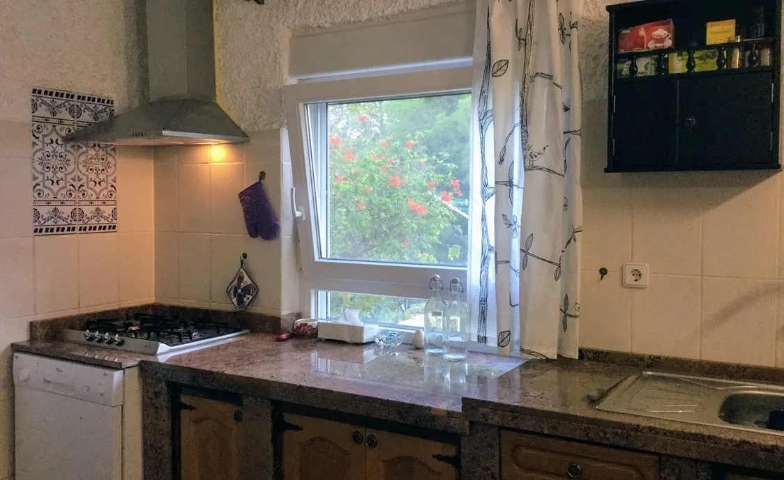 - Ausstattungen: Backofen, Gefrierschrank, Geschirr und Besteck, Geschirrspüler, Kaffeemaschine, Kochplatten mit Gas, Küchenutensilien, Kühlschrank, Mikrowelle