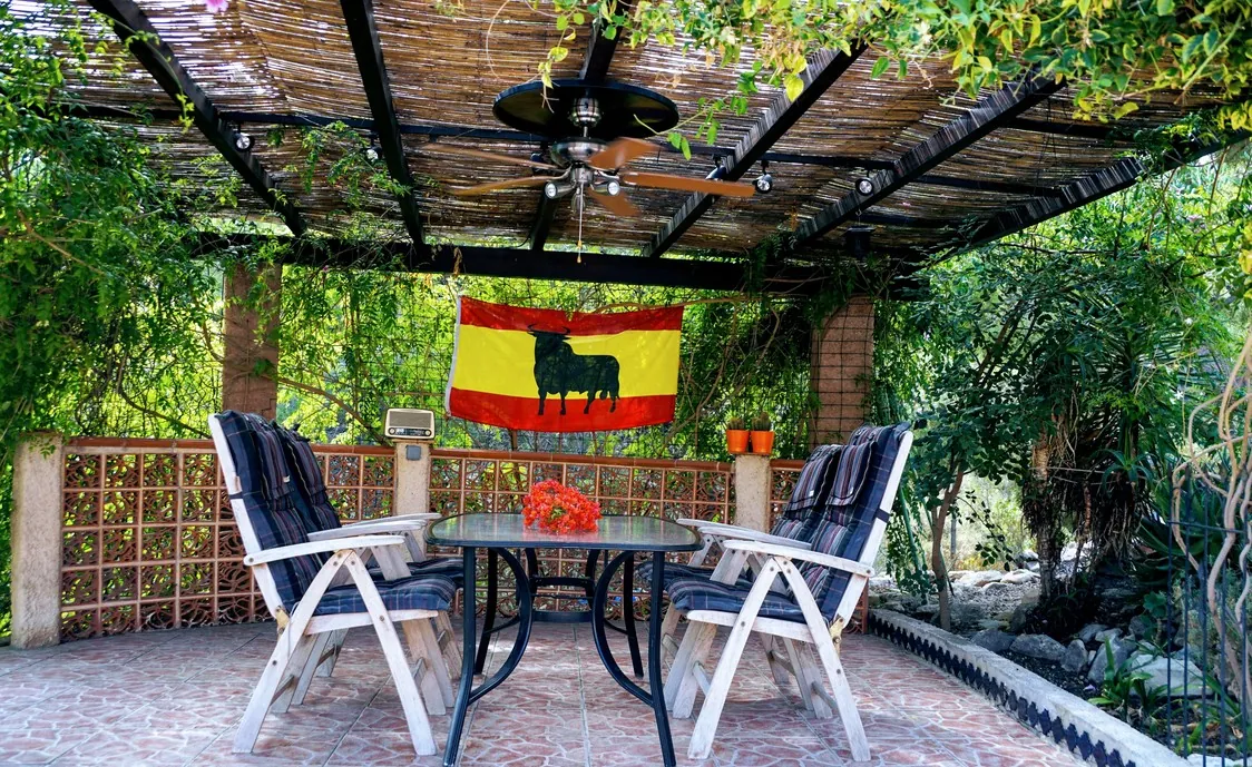 Vor dem Ferienhaus gibt es einen großen Parkplatz und die Villa wird von mehreren Terrassen (teilweise überdacht) und einem subtropischen Garten umgeben.