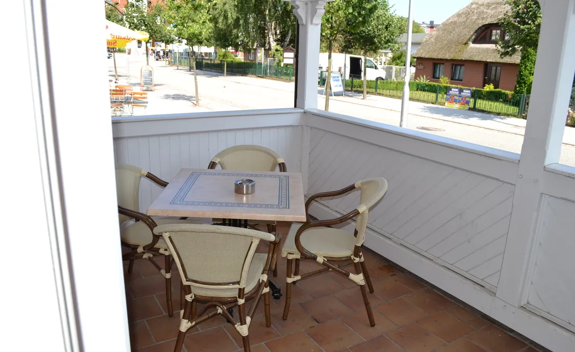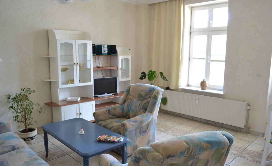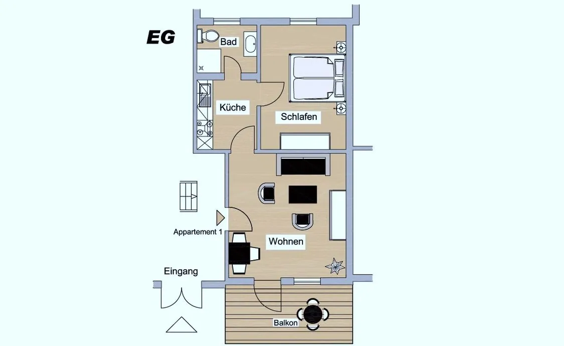Über einen separaten Eingang gelangt man in den Wohnbereich. In dem großzügigen Wohnraum befinden sich eine Sitzcouch mit Tisch und Sessel, ein Esstisch mit Stühlen und eine Schrankwand mit TV-Gerät. Von diesem Raum gelangt man auch auf den großen Balkon mit Sitzmöbeln. In diesem Appartement können unsere Gäste einen kostenlosen WLAN-Internetzugang nutzen.