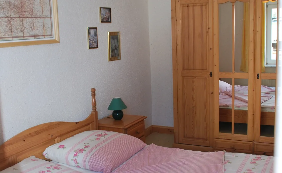 Im Schlafzimmer befinden sich ein bequemes Doppelbett mit Nachttischen und Leselampe sowie ein Kleiderschrank mit Spiegel.